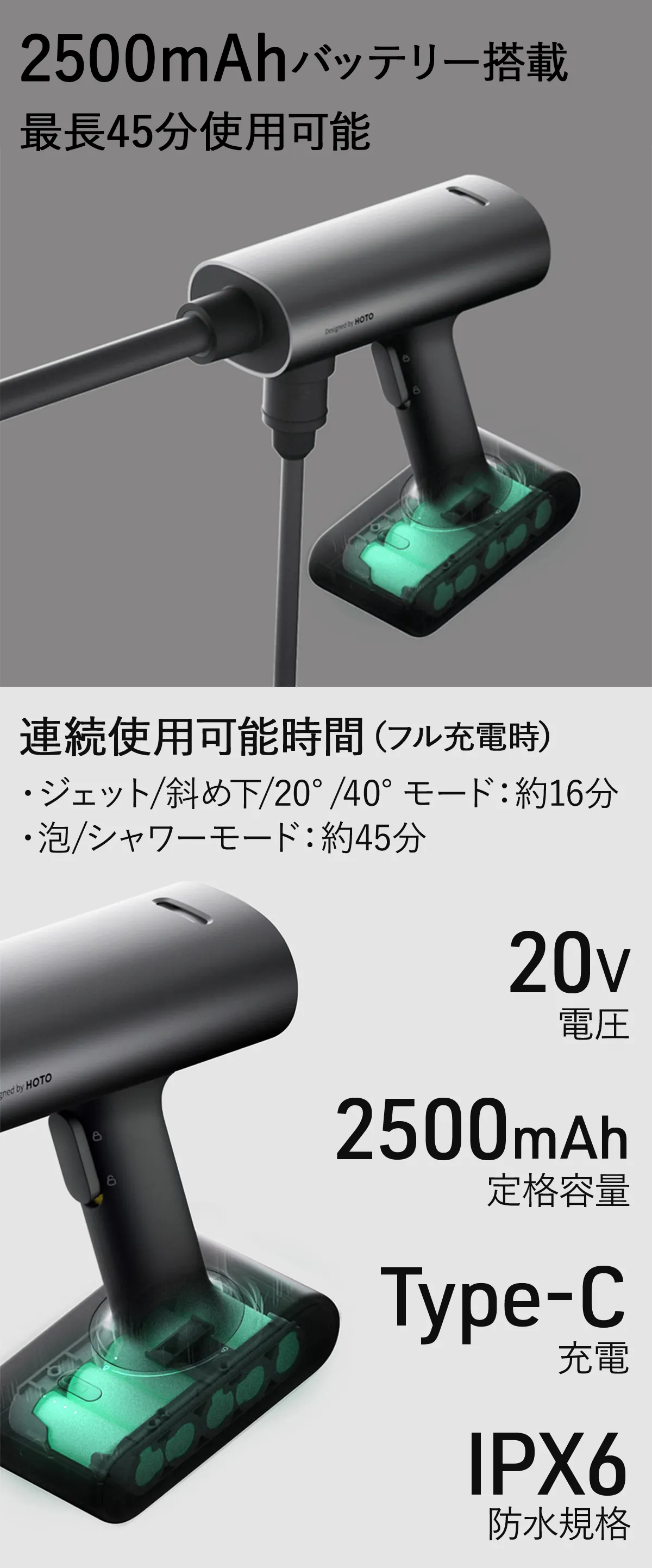 HOTO Washer ProのバッテリーはUSB Type-Cの急速充電にも対応!