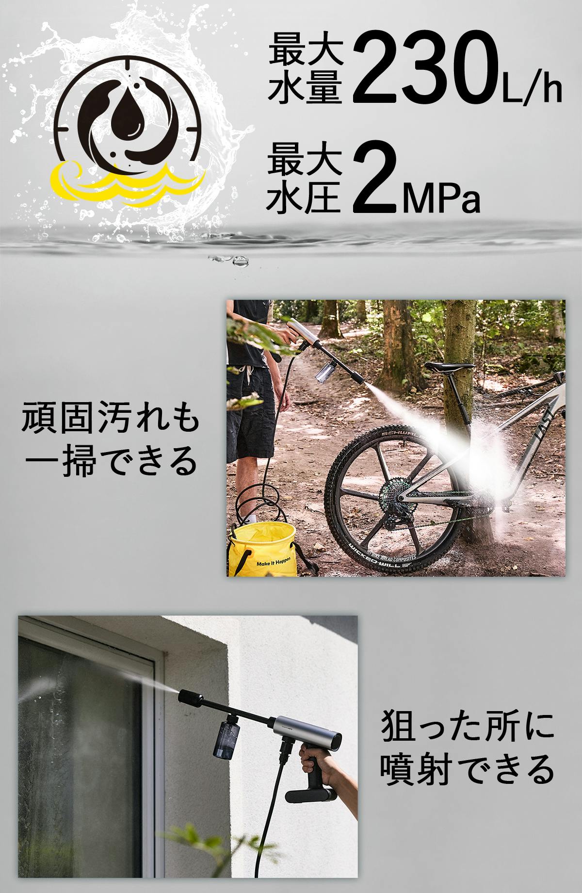 水道不要のガンタイプとしては非常に多い最大水量230L/hで、「扱いやすい」はそのままにどんどん汚れを落とします!