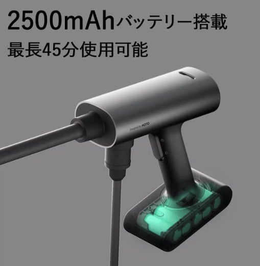 搭載されている2500mAhバッテリーは、最長45分の使用を可能にします。これにより、一度の充電で広い範囲のクリーニング作業をこなすことができ、作業効率が向上します。また、長時間の使用が求められる状況でも安心してお使いいただけます。