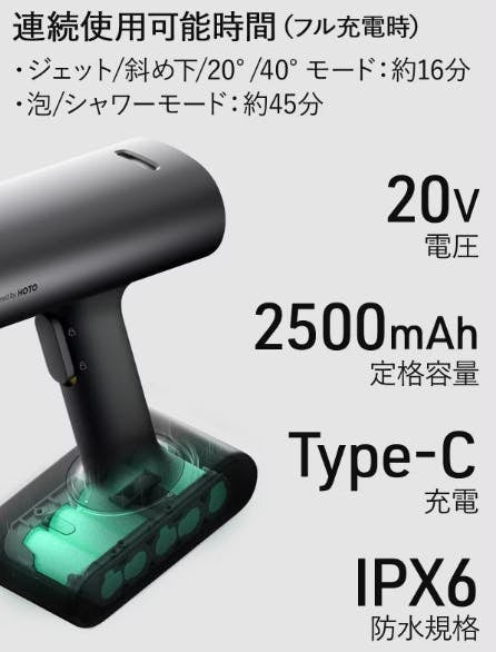 HOTO Washer Proは、急速充電と長時間使用が可能な2500mAhバッテリーを搭載した洗浄機として、忙しい現代生活に最適な製品です。手軽に持ち運びながらも、充実のバッテリー性能で効率的なクリーニングを実現します。