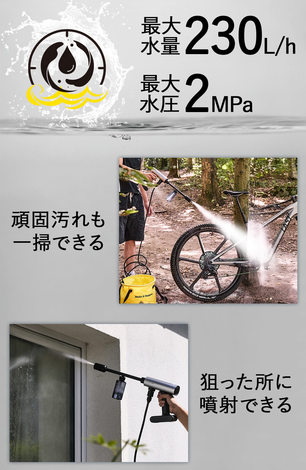 高圧洗浄機として気になる水圧は最大で2MPa、最大水量は230L/h。
