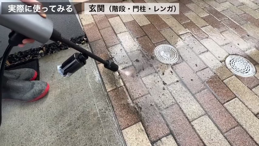 気になり出すと止まらない(?)玄関タイル目地の汚れですが、かがんでブラシでこすり落とすよりも、Washer Proで洗い流す方がずっとラクであることがお分かりいただけると思います!