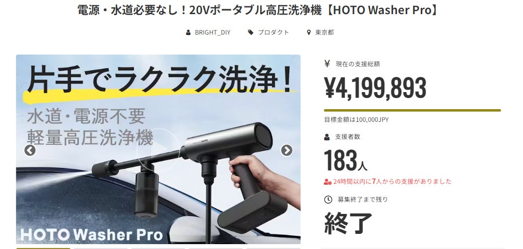 「電源・水道必要なし!20Vポータブル高圧洗浄機【HOTO Washer Pro】」支援者様、お世話になっております。BRIGHT DIYチームです。この度は沢山の支援者の方々に多大な支援頂き、有難うございました。お陰様で、無事にプロジェクト終了日を迎えることができました。早速皆様のリターンを2024年06月末にお届けできるよう準備を始めております!リターン到着まで、今しばらくお待ちいただけますと幸いです。また進捗あり次第ご報告致します。どうぞよろしくお願い致します。BRIGHTチーム