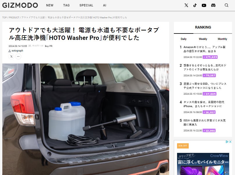 皆様、こんばんは !Brightチームです。お世話になっております。3月14日 、Lifehackerで【HOTO WASHER PRO 】を紹介して頂きました!話題:電源も蛇口も不要。いろんな場所で使えるポータブル高圧洗浄機「HOTO Washer Pro」の先行販売が終了間近是非下記のリンクからアクセスしてみてください。https://www.lifehacker.jp/article/machi-ya-hotowasherpro-end-717126/ 【レビューの一部抜粋】〈 ポータブルだから出先でも使える動力は取り外し可能な2500mAhのバッテリー。最大で45分使用が可能とのこと。バッテリーの充電はUSB Type-Cにて。急速充電にも対応し、40W以上の充電器を使えばば90分でフル充電。今使っているノートPCなどの充電器がそのまま使えるのがいいですね!なお、このバッテリーはモバイルバッテリーとしても使えるのがポイント。しっかり充電して保管しておけば非常時にも役立ちますよ。給水は自吸式ホースを使ってバケツなどから可能。ろ過フィルターを採用しているため、雨水や風呂の残り湯も利用OK。現地で水さえ確保すればいろんなアイテムをキレイにできるので、海でのサーフィンや山での自転車遊び、キャンプやBBQでも活躍してくれそうです。>Bright DIYチームでした! ご興味のある方、ぜひ支援お願い致します。https://camp-fire.jp/projects/view/717126Brightチームは、当プロジェクトをもっと多くの方に知っていただきたいと考えております。よかったら、FacebookやTwitter等のSNSでのシェア・拡散をお願い致します。#hotowasherpro #brightdiyどうぞよろしくお願い致します。Brightチーム