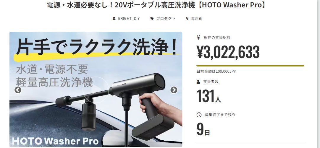 皆さんこんにちは、BRIGHT DIYチームです。この度は「HOTO WASHER PRO」を支援いただき、本当にありがとうございます。おかげさまで開始から数分で目標を達成することが出来ました。また本日 (3月13日) のCAMPFIREランキングプロダクト部門で9位に入賞することが出来ました♪https://camp-fire.jp/projects/view/717126皆さまの支援を励みに、喜んでいただける製品作りに努めてまいります。SNSでのシェアや身近な方にもおすすめしていただけると嬉しく思います。#hotowasherpro #brightdiyどうぞよろしくお願いいたします。ありがとうございました。スタッフ一同