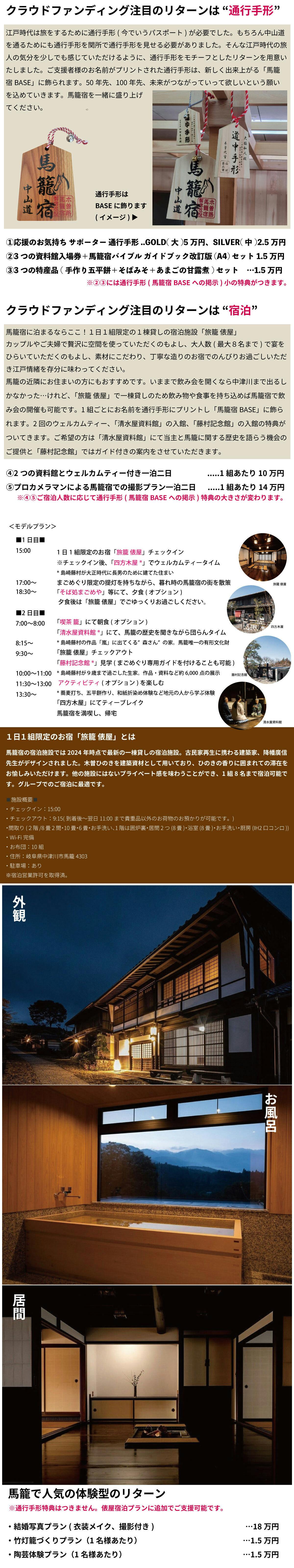 クラウドファンディングで集まった資金は、「馬籠宿BASE」リノベーションのための費用とCAMPFIREの利用料に使用させていただきます。募集方式について:本プロジェクトはAll-in方式で実施します。目標金額に満たない場合も、計画を実行し、リターンをお届けします。
