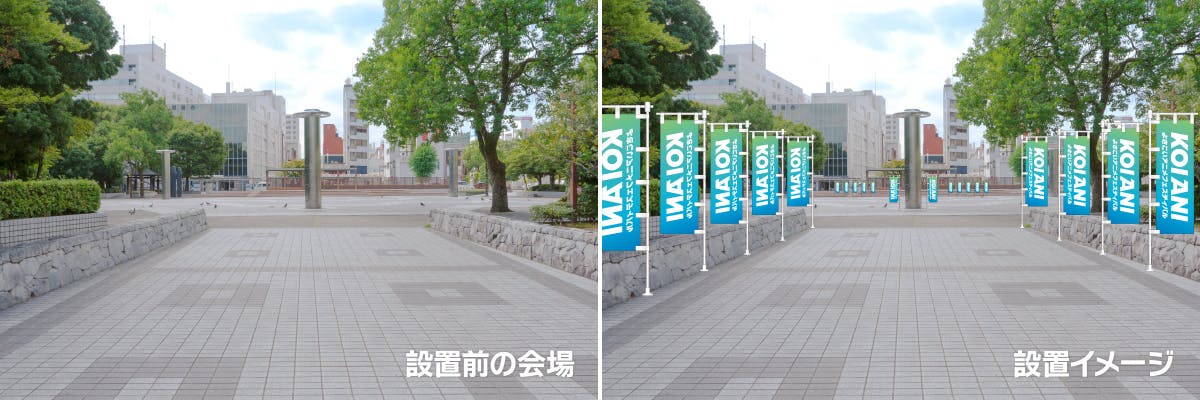 のぼり旗は「W450mm・H1500mm」サイズを50本を会場各所に設置します。