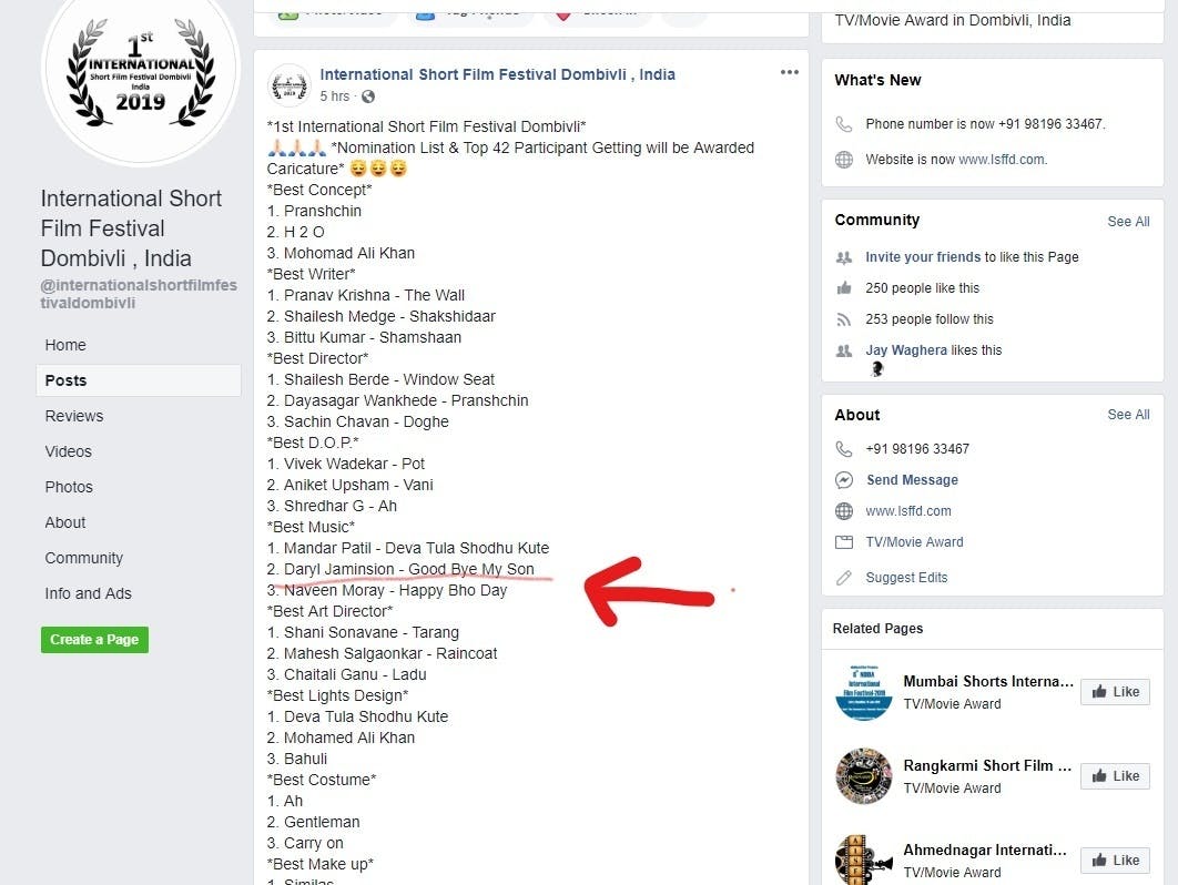 I am exaggerated to address that my short film ’Goodbye my son’ won the Best Music Award! 1st International Short Film Festival Dombivli! Congrats on my best music composer, Daryl Jamiesson! I am really proud of you! All my gratitude is sent to the film crews and supporters as well as film festival staff.