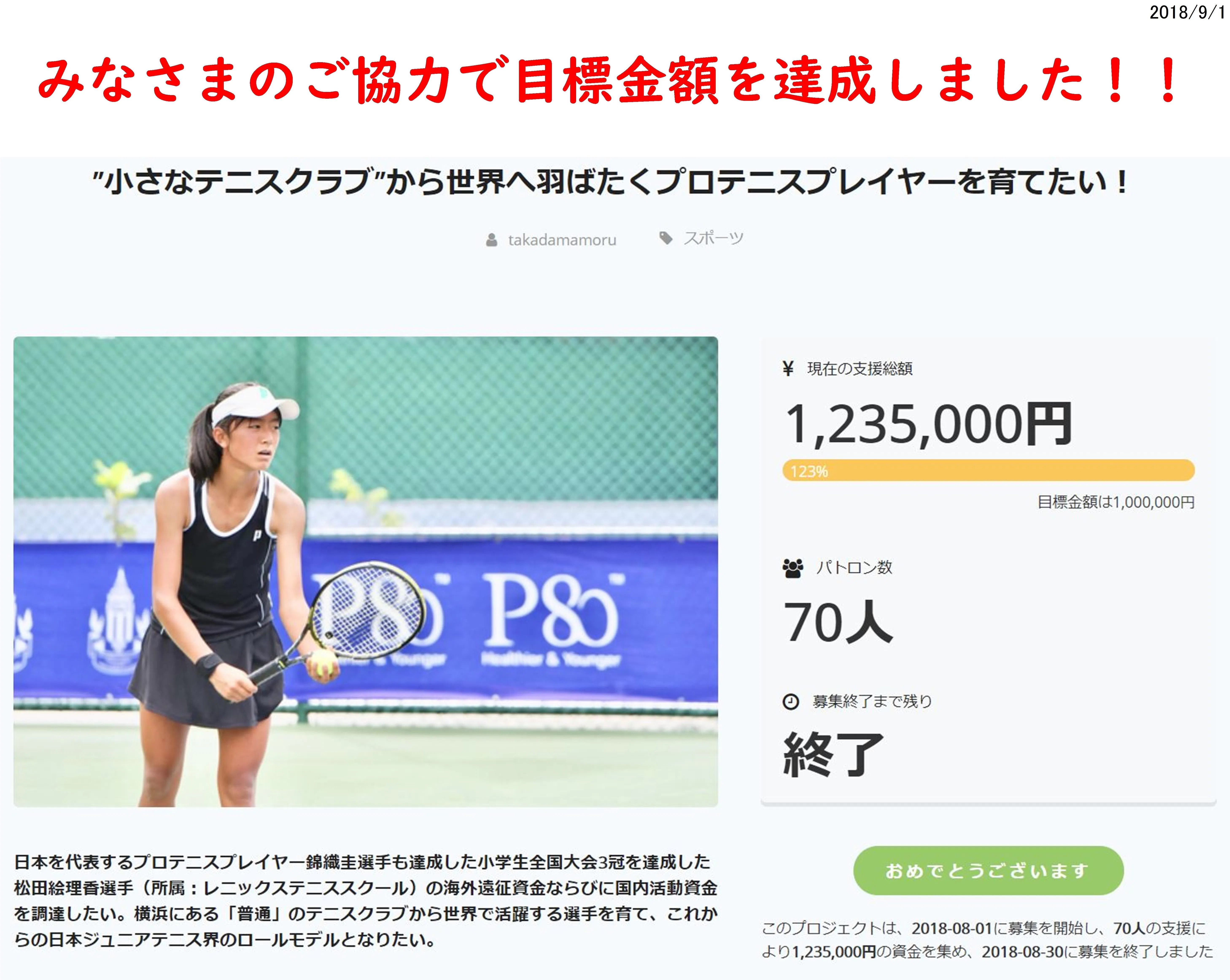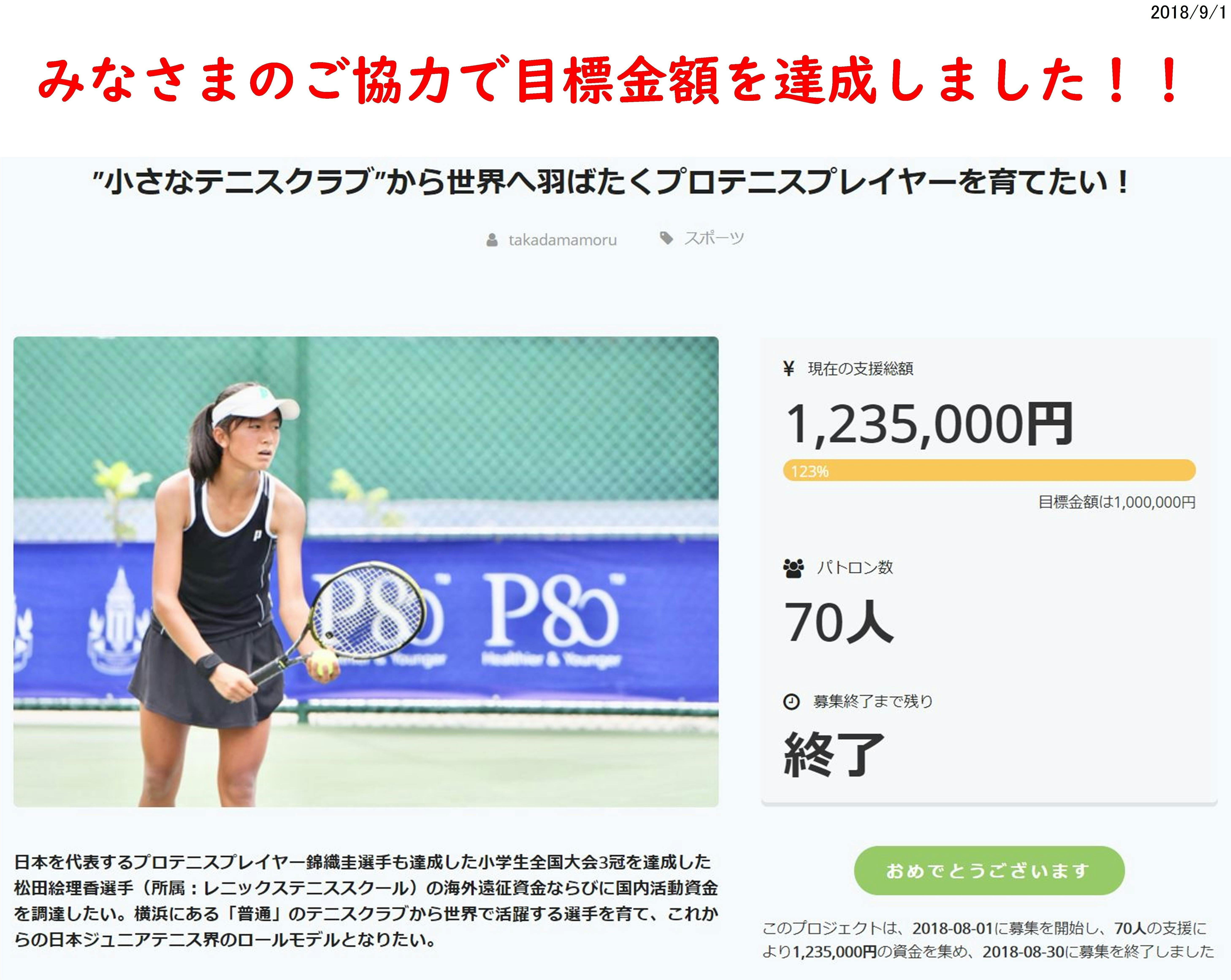 ※プロジェクト期間内に利用していたキャンプファイヤー内の「活動報告」とリターンの「活動報告メール」は異なります。また、キャンプファイヤー内の「活動報告」は現在出場している兵庫ITF2週目終了までとさせていただきます。