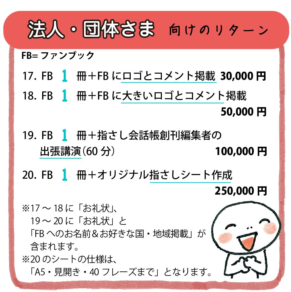 指さし会話帳を、創刊して間もない頃から知るコアな読者の方も、今回クラウドファンディングをきっかけに知ったという方も、海外旅行や文化は好きなはず。そこで20種以上のリターンをご用意、きっとあなたの好みに合うものが見つかるはずです。