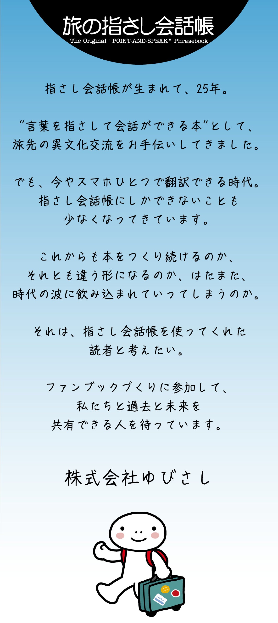 ぜひ、今回のプロジェクトにご支援いただき、私たちといっしょに、指さし会話帳と、異文化コミュニケーションの未来について考えていただければと思います。