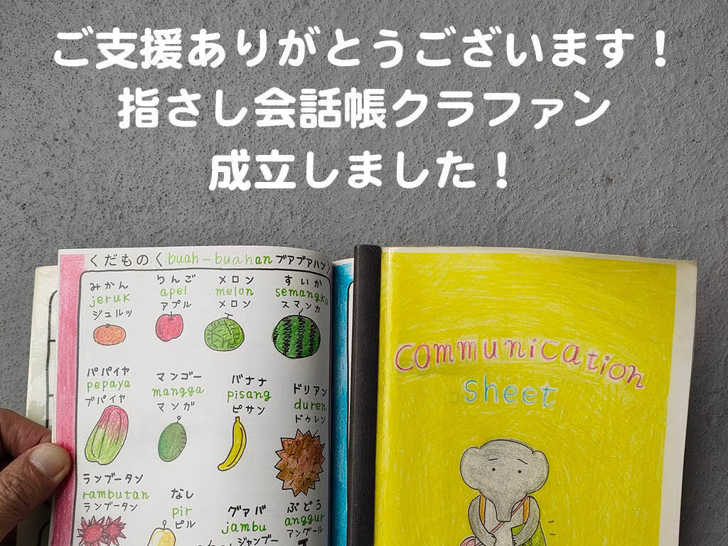指さし会話帳クラファンにご協力くださった皆さまへこの度は、指さし会話帳25周年のクラウドファンディングにご協力いただき、ありがとうございました。開始当初は、大きな目標とAll or Nothingを掲げたこともあり、いったいどこまでのご支援をいただけるのかと正直不安に思っていました。しかしながら蓋を開けてみれば、クラウドファンディング期間を通じてだんだん積みあがっていく支援額に、多くの方々の熱意を本当に感じることができました。著者の皆様や関係者各位のご協力を得て、また、なによりも読者・ユーザーの皆様からジワリジワリとご支援をいただき、おかげさまで260万円の目標金額を突破し、ファンブックを制作することが決まりました。(201名の方々から、3,155,000円ものご支援をいただくことができました)今回の、指さし会話帳25周年の記念企画の一番の目的は、読者・ユーザーの皆さまを含め、これまで指さし会話帳に携わってくださった方々と、もう一度「指さし会話帳」というコンテンツの意義を考えることでした。この約1か月ほどの期間で、いまでもたくさんの方々が、その価値について意見やご支援の意思を持ってくださっていることを実感いたしました。また、関係者の皆様と改めて一つの目標に歩みを進めることができたことも貴重でした。この後、ファンブックを作っていくなかで、さらに深く、指さし会話帳への思いを聞かせていただければと思っています。ひとまず、クラファン成立までのご協力に、御礼申し上げますとともに、ファンブックの制作では、ぜひぜひ皆さまの貴重な体験をお知らせください。多くの方の思いを詰め込んだ、ファンブックをつくり、思いを分かち合うことを楽しみにしております。指さしクラファンスタッフ一同 & 株式会社ゆびさし一同