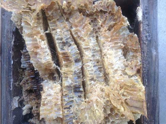 ざるに置いて、ポタポタ茶色い蜜を落としてみます。蜜ロウも使えるように精製できたらいいなあ。