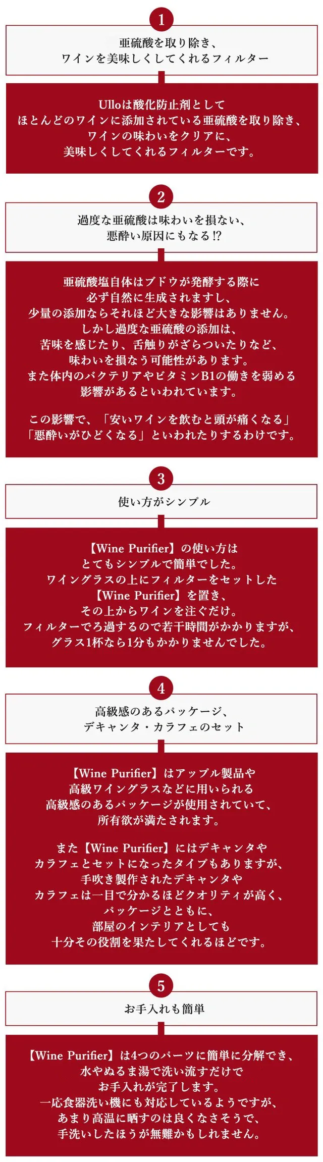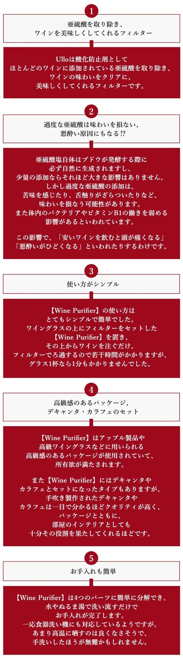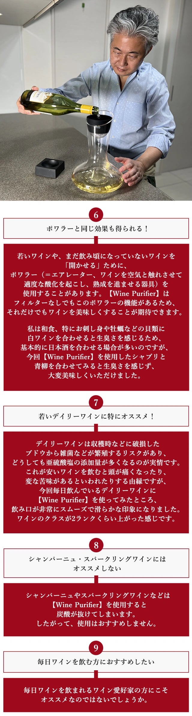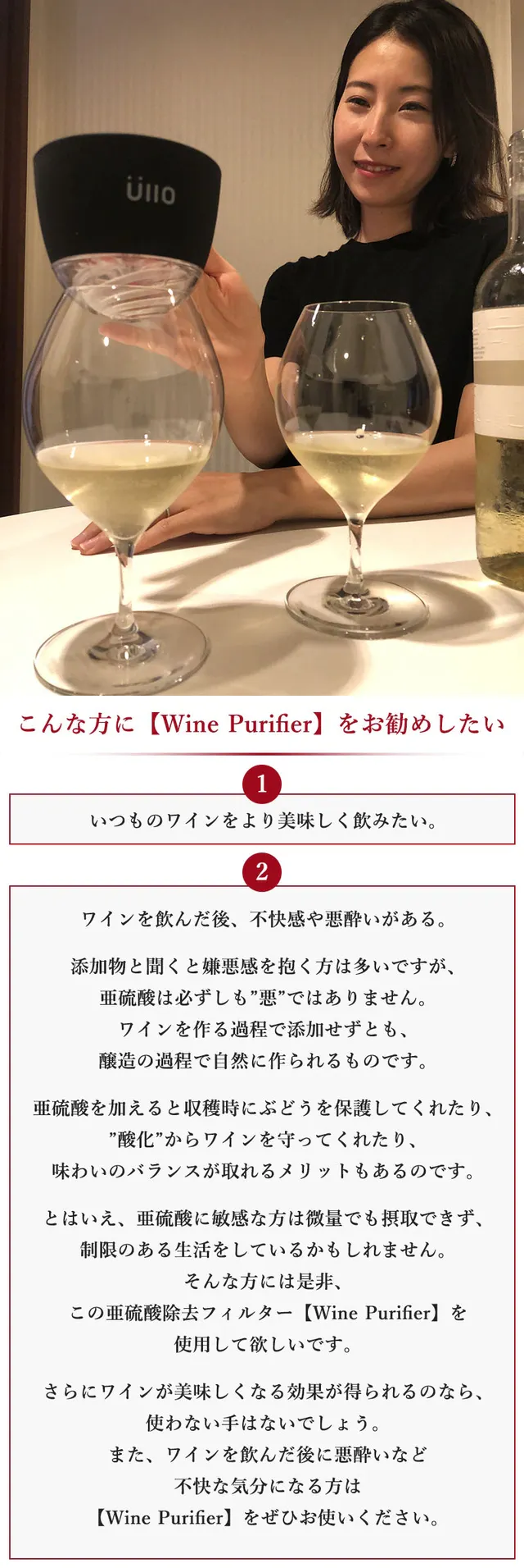 【Wine Purifier】はワインの味や人の健康に良くないと言われている不要な食品添加物・亜硫酸だけを取り除き、ワインの味を高めるワインフィルターです。