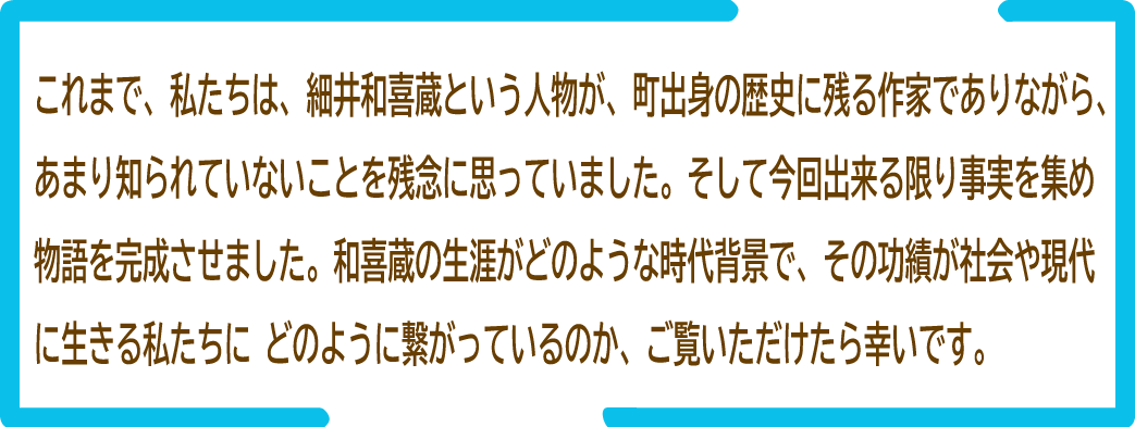 これまであまり語られなかった、町出身の作家「細井和喜蔵」について調べてみようと思ったのは、2011年の『エイエンノヘイワ』紙芝居完成の数年後でした。和喜蔵は無名のうちに若くして亡くなった為、その生涯を追うことは、困難を極めました。完成までには何度も挫折し、足掛け8年の歳月がかかり、今年ようやく台本が完成しました。