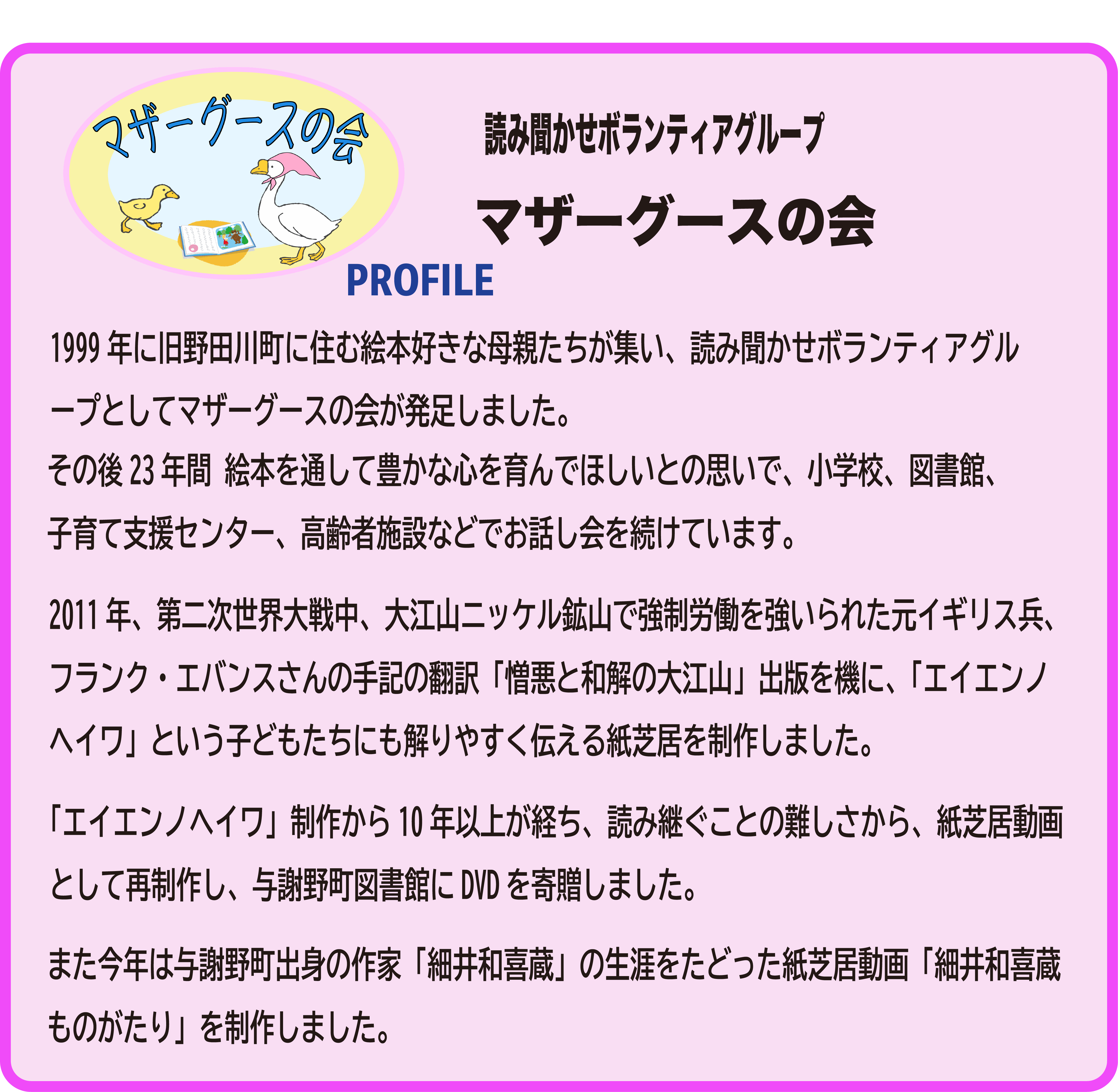 マザーグースの会は、2011年に「エイエンノヘイワ」という紙芝居を作りました。それは、第二次世界大戦中に捕虜として与謝野町で苛酷な強制労働を強いられた、元イギリス兵フランク・エバンスさんの体験をもとにしたお話しでした。