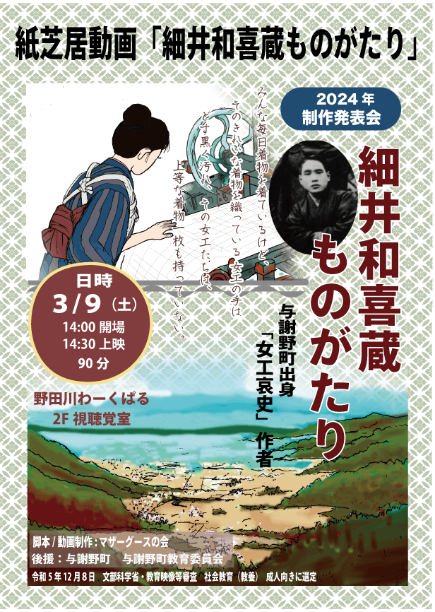 紙芝居動画「細井和喜蔵ものがたり」が、文部科学省の教育映像等審査で、 社会教育(教養)成人向きに選定されました。
