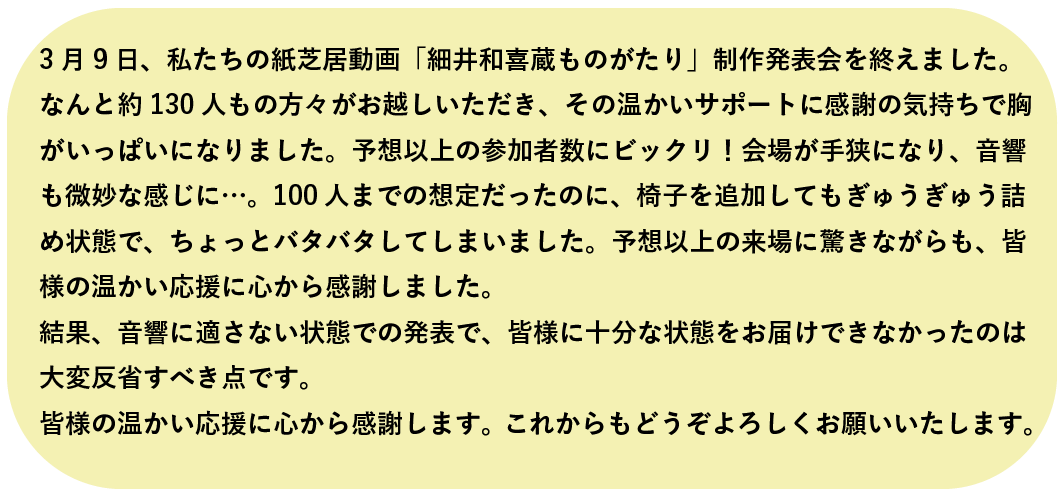 発表会以降、紙芝居動画「細井和喜蔵ものがたり」の上映依頼をお受けする予定です。気軽にお申し出ください。また「エイエンノヘイワ」についても受け付けております。