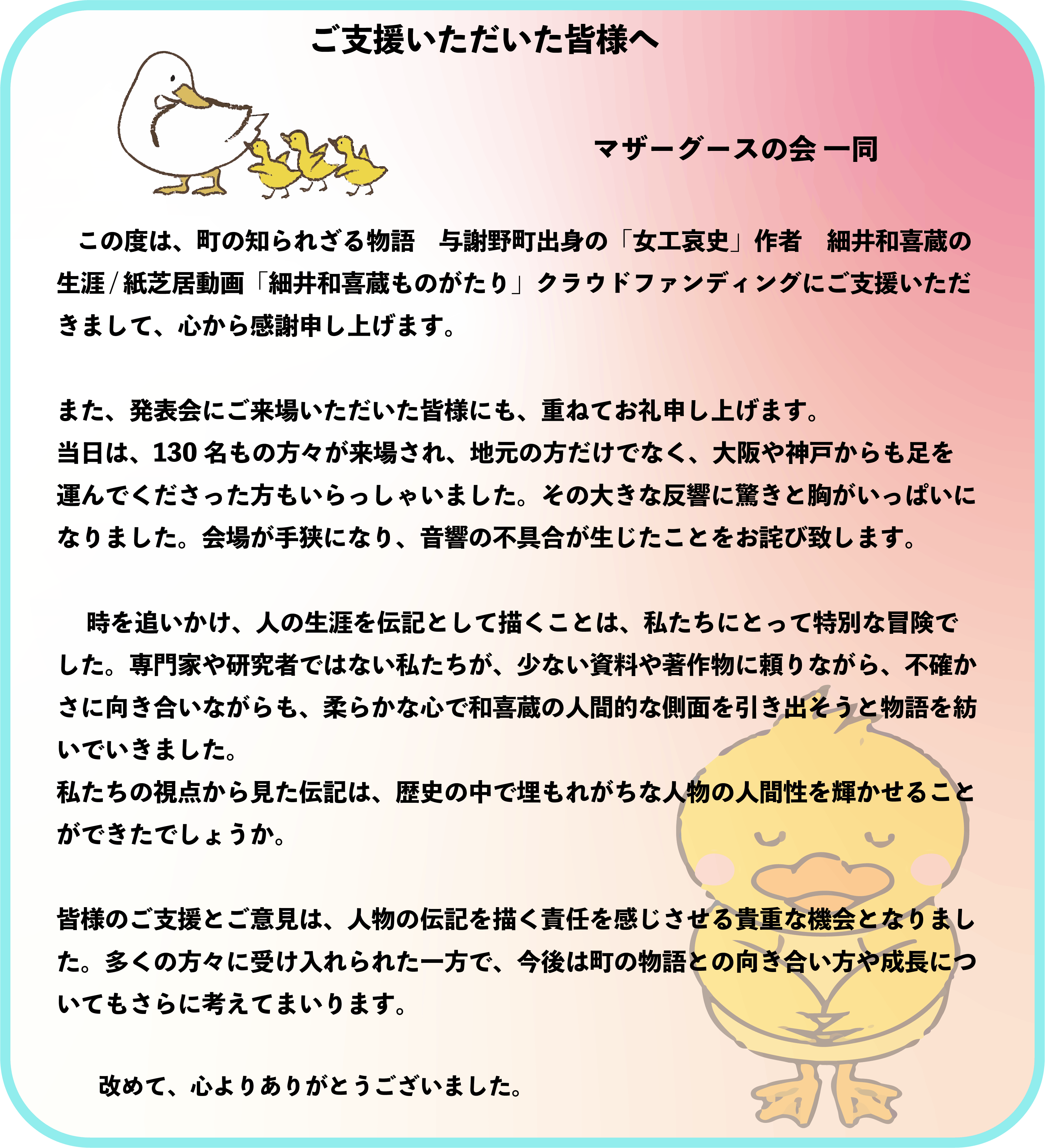 素人グループの作品ではありますが、将来にわたって、多くの人と共に、町の物語を紡いでいきたいと言う思いで、『細井和喜蔵ものがたり」を最初から動画として制作をしました。しかしながら力及ばす、このような形でみなさんの支援をお願いする形となりました。ご理解いただけたら幸いです。どうぞよろしくお願いいたします。