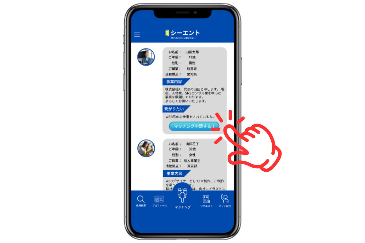 サービス内容はいたってシンプル。ログインすると、会員のプロフィールが一覧で表示されます。「この人と繋がりたい!」と思ったら、「マッチング申請する!」をクリック。