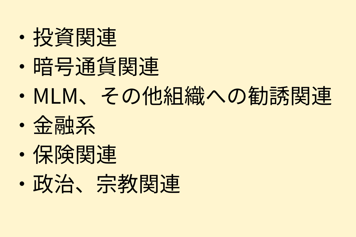 また、下記の業種に該当される方は入会NGとさせていただきます。ご支援いただく前に今一度ご確認をお願いいたします。