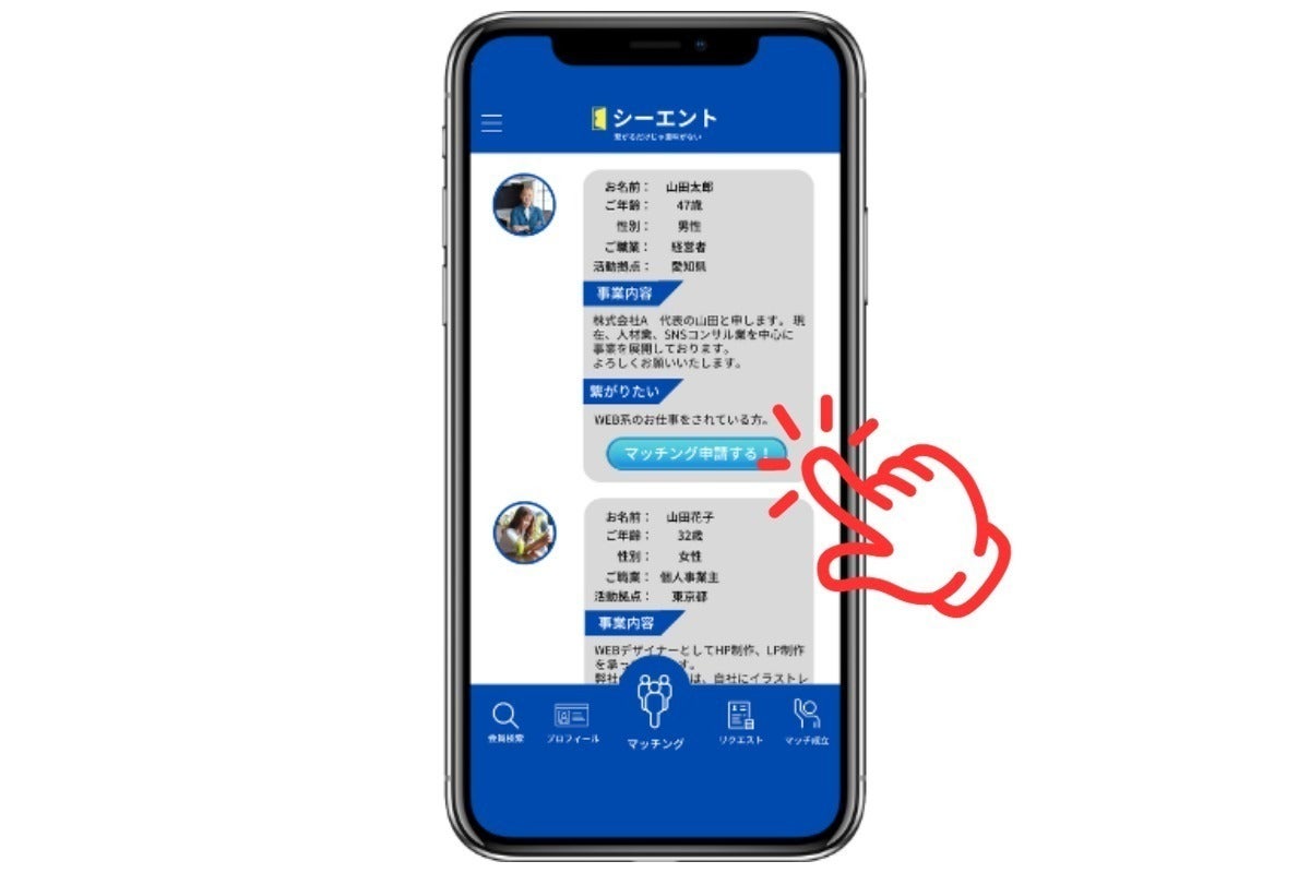 シーエントは仕事に繋がる人脈づくりはもちろん、情報交換や協業パートナー探しなど、さまざまな用途にお使いいただけます。