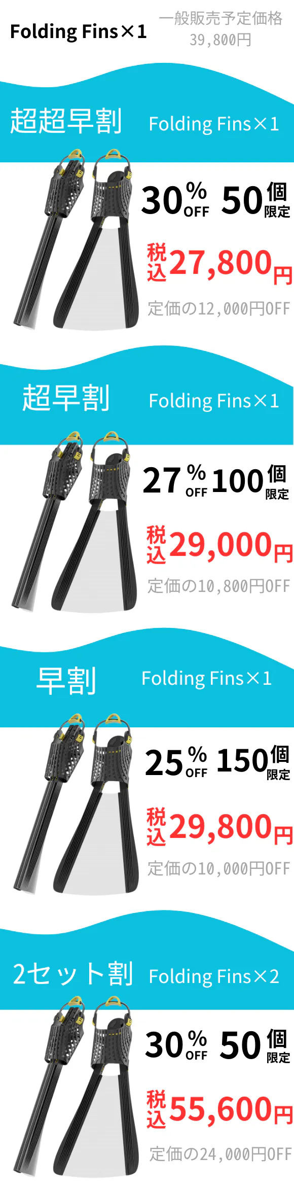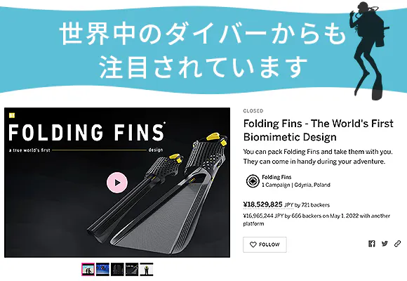 2024/02/24 20:06ご支援者の皆様いつも大変お世話になっております。大変おまたせいたしました。Folding Finsですが、国内での発送作業を本日すべて完了いたしました。皆様の手元には、明日以降順次到着予定です。到着までしばらくお待ちください。この度はご支援いただき、誠にありがとうございました。 もっと見るプロジェクト終了と御礼