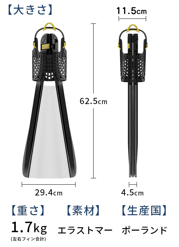 A. Folding Finsの重さは左右で約 1.7 kgです。水を掻くための優れた水中性能を維持しながら、できるだけ軽くするように設計されています。