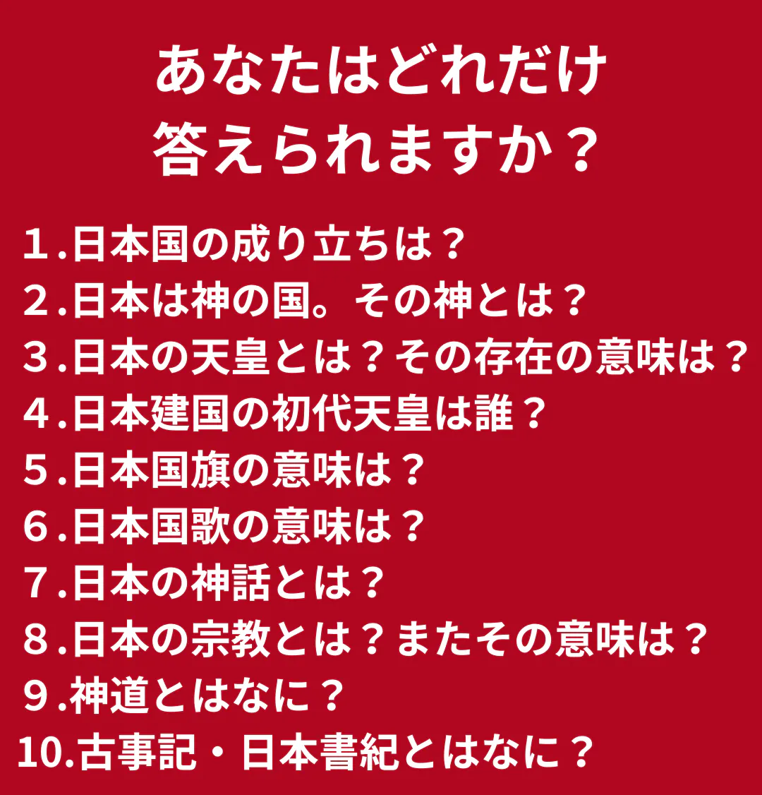 GHQの占領政策の影響で、多くの日本人は自国の起源や歴史について「いつ?どこで?誰が?」という基本的なことさえ答えられなくなりました。他の国々と比べても、このような状況は日本特有のものなのです。