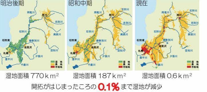 私たちの暮らす石狩川流域には150年前まで広大な湿原が広がっていて、現在の釧路湿原の3倍ほどもありましたが、開拓等によって99.9%が消失しました。