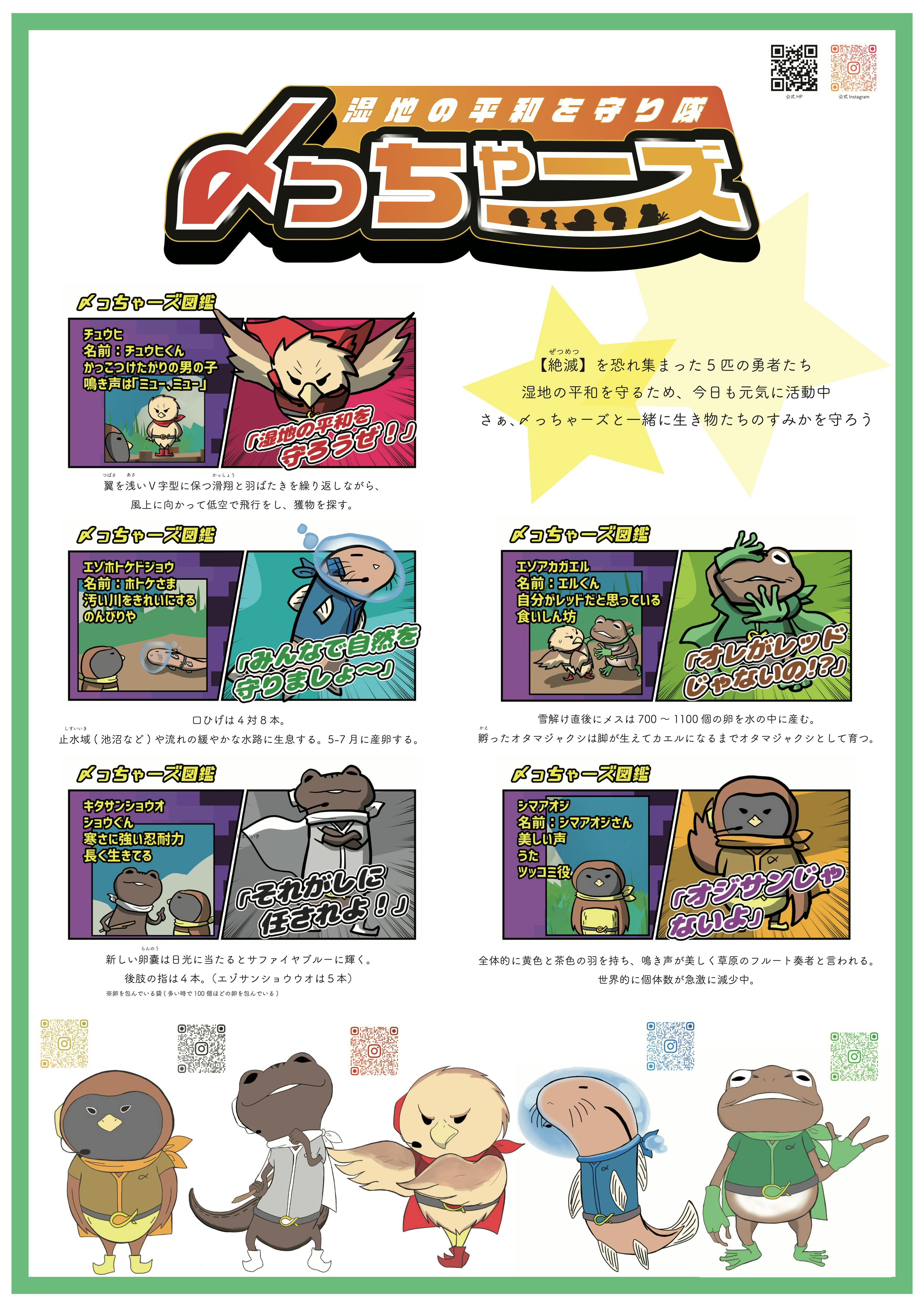 そして2年ほど前からは、知り合った学生達とタッグを組んで、「湿地を守る戦隊〆っちゃーズ」という湿地の生き物のキャラクターを制作しました。