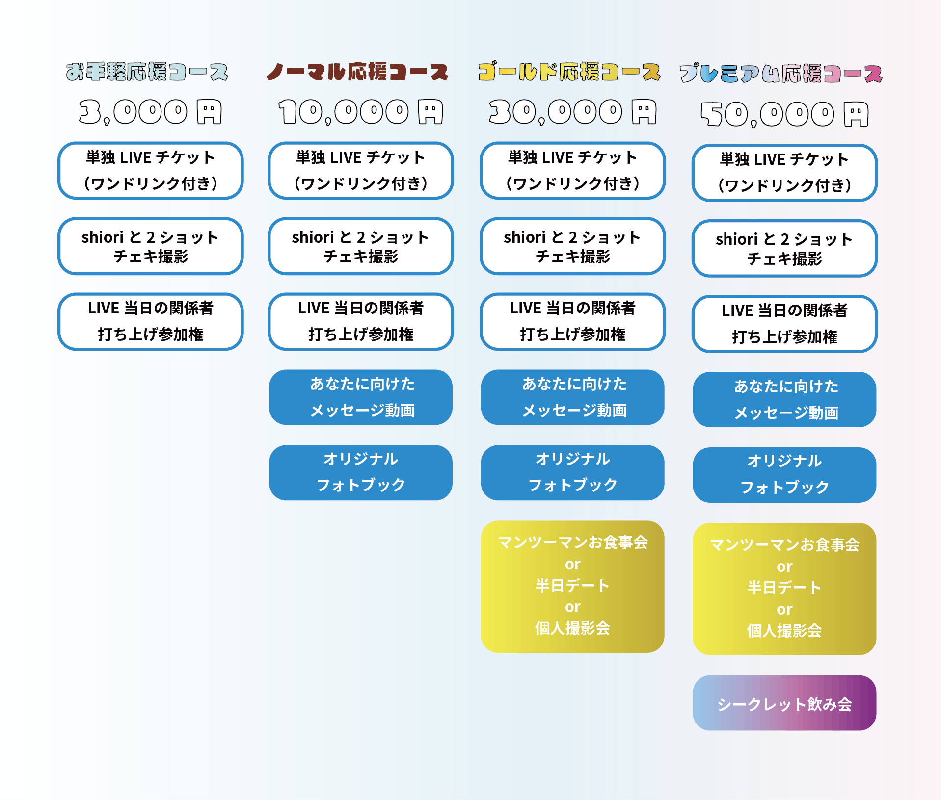 今回の単独LIVE実現へご支援くださった皆様にshihoriの事をもっと知ってもらえるように、出来る限り多くのリターンをご用意しました。