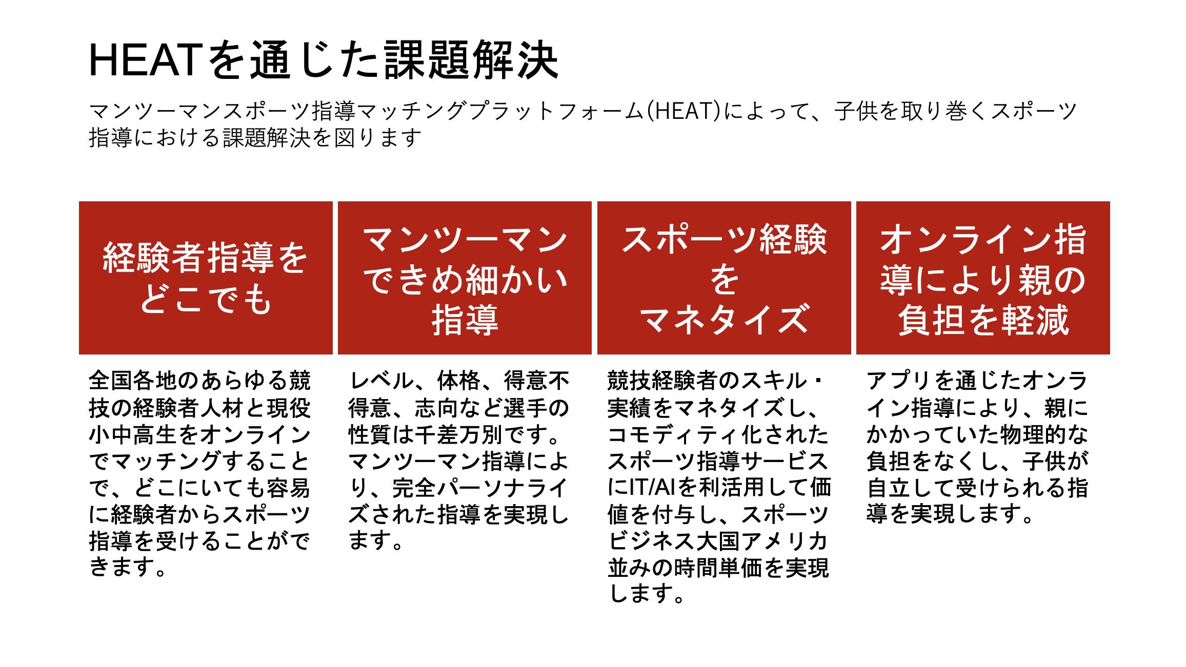 HEATでは、「運動部に所属する小中高校生の『もっと上手くなりたい』を育む、叶える。」をミッションに掲げ、現役運動部生と競技経験者を繋ぐマッチングプラットフォームの立上げを行なっています。