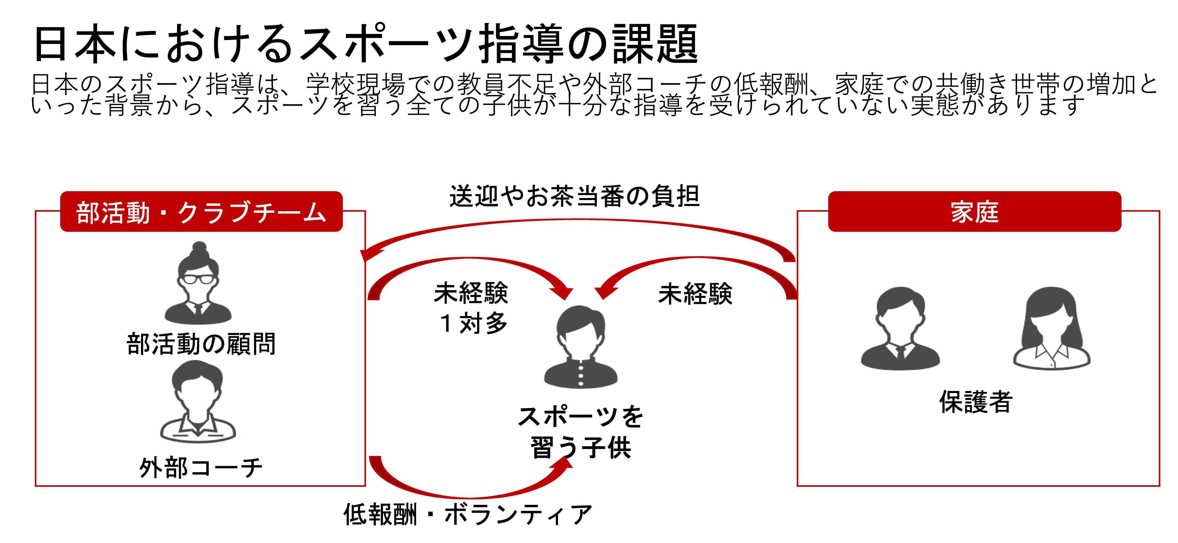 昨今の日本の部活動は、教員不足や外部コーチの低報酬、部活動の多様化といった社会的背景から、4割を超える指導者が自身の受け持つ部活動の経験がない中で子供たちを指導しているという現状があります。運動部活動やクラブチームに所属するお子様を持つ親御様におかれましても、自身の子が習っているスポーツの経験が必ずしもあるわけではなく、習い事の送迎やお茶当番などの決して小さくない負担が存在するのではないでしょうか?