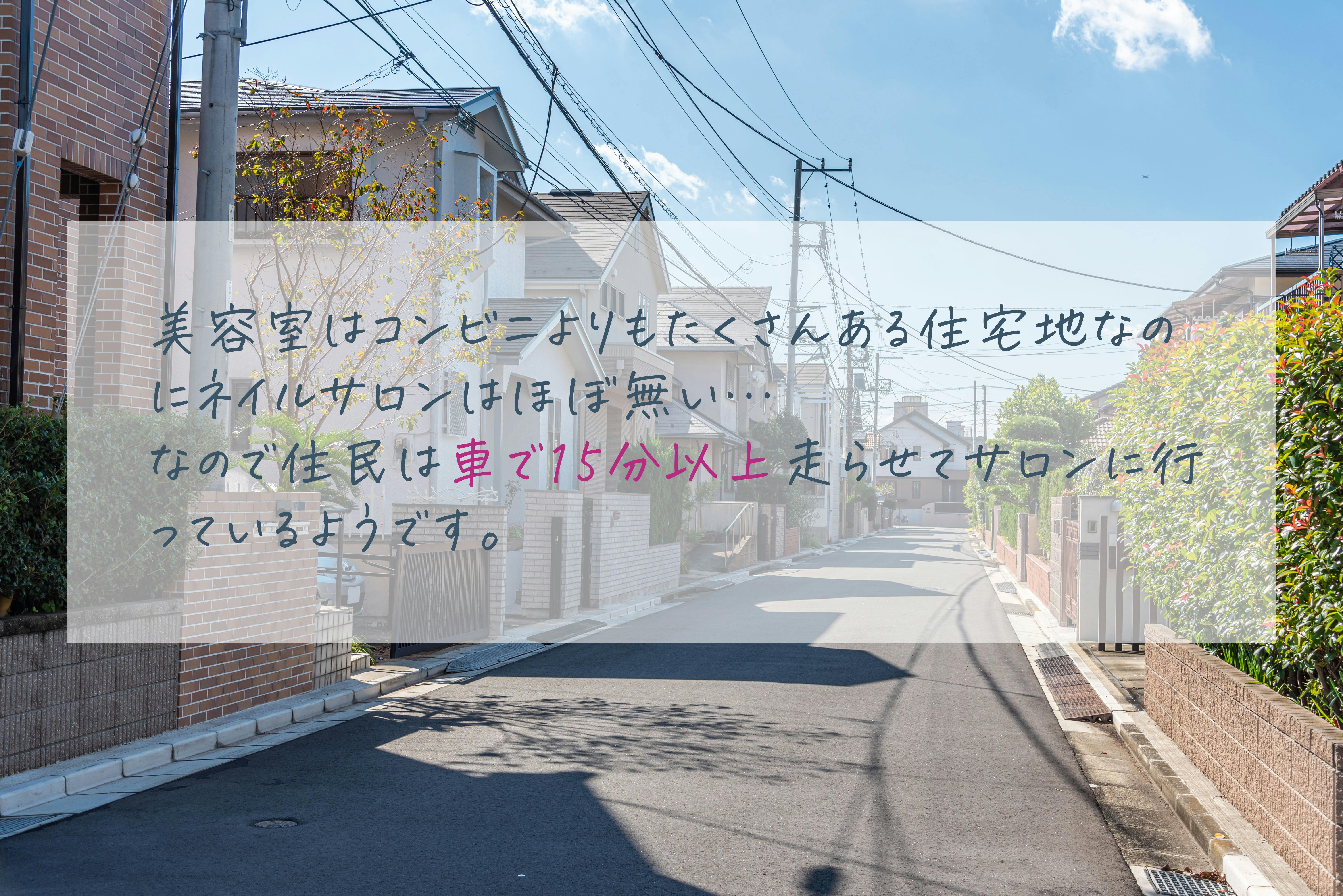 我が家がある住宅地は広さの割にはネイルサロンが非常に少なく、住民たちは車に乗ってサロンに行くしかありません。また工業団地が近くにあるため仕事終わりに癒されたい女性は必ずいるはず!と感じ自宅近くの賃貸を借りて開業したいと思いました。