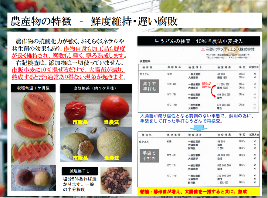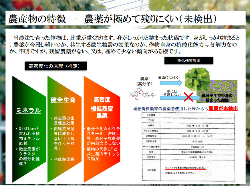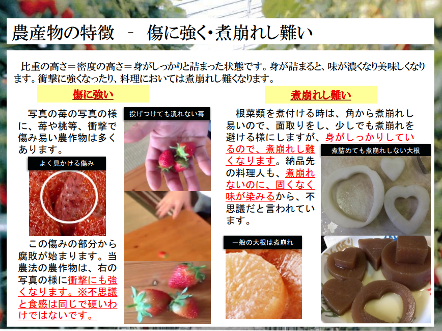 「山を見てみろ!山は化学肥料など使ってないだろう。 追肥も除草剤もいらないで何百年も豊かな恵みをもたらしてくれる。それはその土が生きているからなんだよ。土壌細菌などによる恩恵を得ている持続した養分のおかげなんだよ」