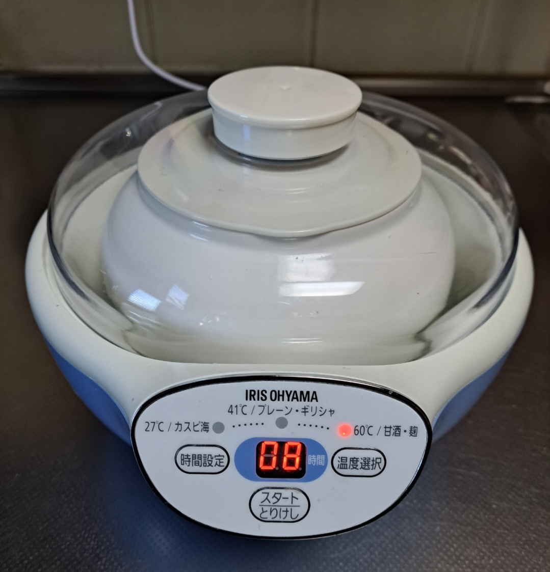 5.炊飯ジャー又はヨーグルトメーカーで55度~60度を保ち、8時間~10時間発酵させる。その間2、3時間おきにかき混ぜると発酵がより進みます。