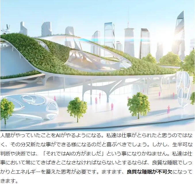 AI技術が進化すればするほど、私達人間の過去の思い出や記憶が逆に素晴らしいヒントになる場合も出てくるでしょう。私達は、常にスッキリした気分で、しっかりと物事の整理ができている思考で、仕事を進めて行かなければなりません。そのために不可欠なのは、やはり良質な睡眠、という事になります。