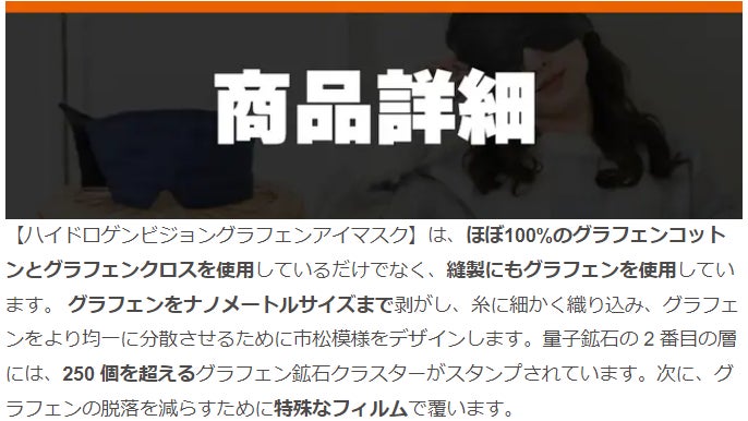 アイマスク素材:ポリエステル繊維(グラフェイン含む)、マイクロミネラル、遠赤外線繊維、