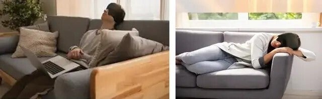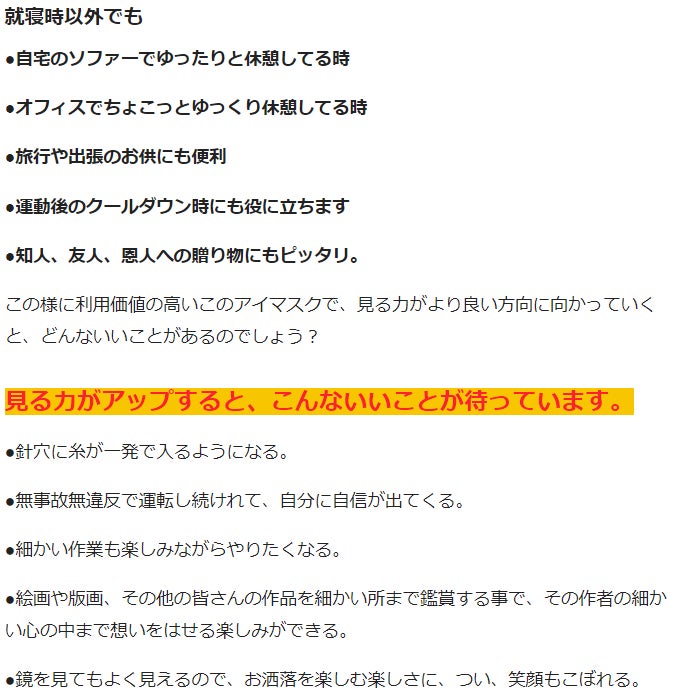【1つ目】何回かご使用になりこの睡眠環境を経験すると、自分なりの感覚を体験する事になります。そしてもし違う場所で、例えばちょっと仮眠したいなと思ってバッグの片隅に入れてあったこのアイマスクを取り出してご使用になったとしましょう。すると違う場所なのですが自分なりの今までと似た同じ様な睡眠環境を実感します。