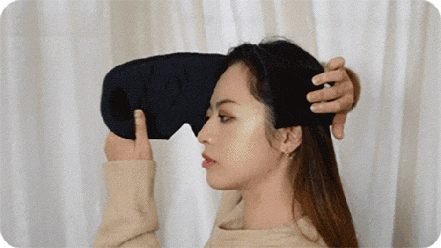 アイマスクを左手で左斜め前で抑えて、右手でくるっと後ろを回した後、右手の方を先に下に入れた後、左手の方を上から被せる様にセットします。こうする事で寝返りに対して剝がれたりひっかかったりしにくくなります。