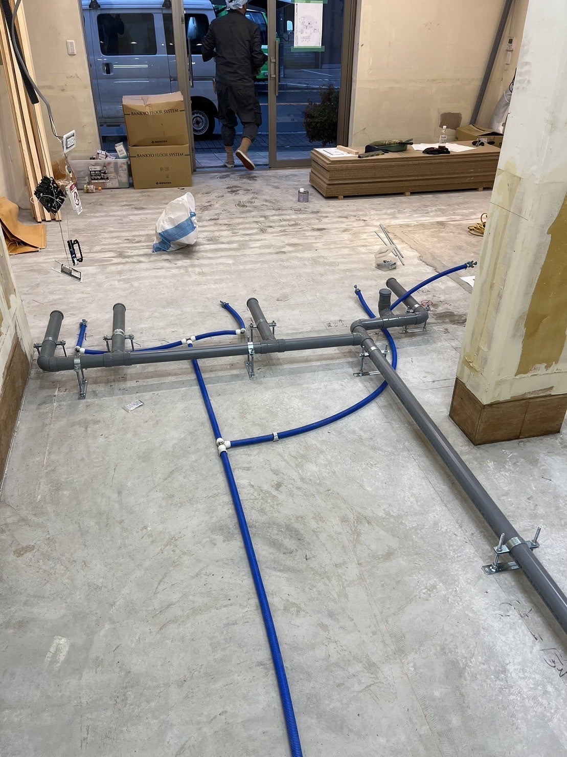 内装工事1日目水周りの配管工事が終わりました。