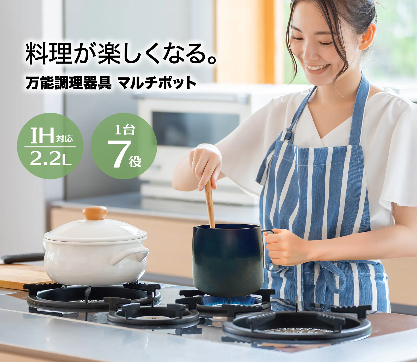 このマルチポットは様々な調理をまかなえるので、沢山の調理器具が不要になって、キッチンをスッキリさせることができます。満水容量は2.2Lと丁度よいサイズ感なので一人暮らしにも、ファミリーにも便利なサイズになっております。