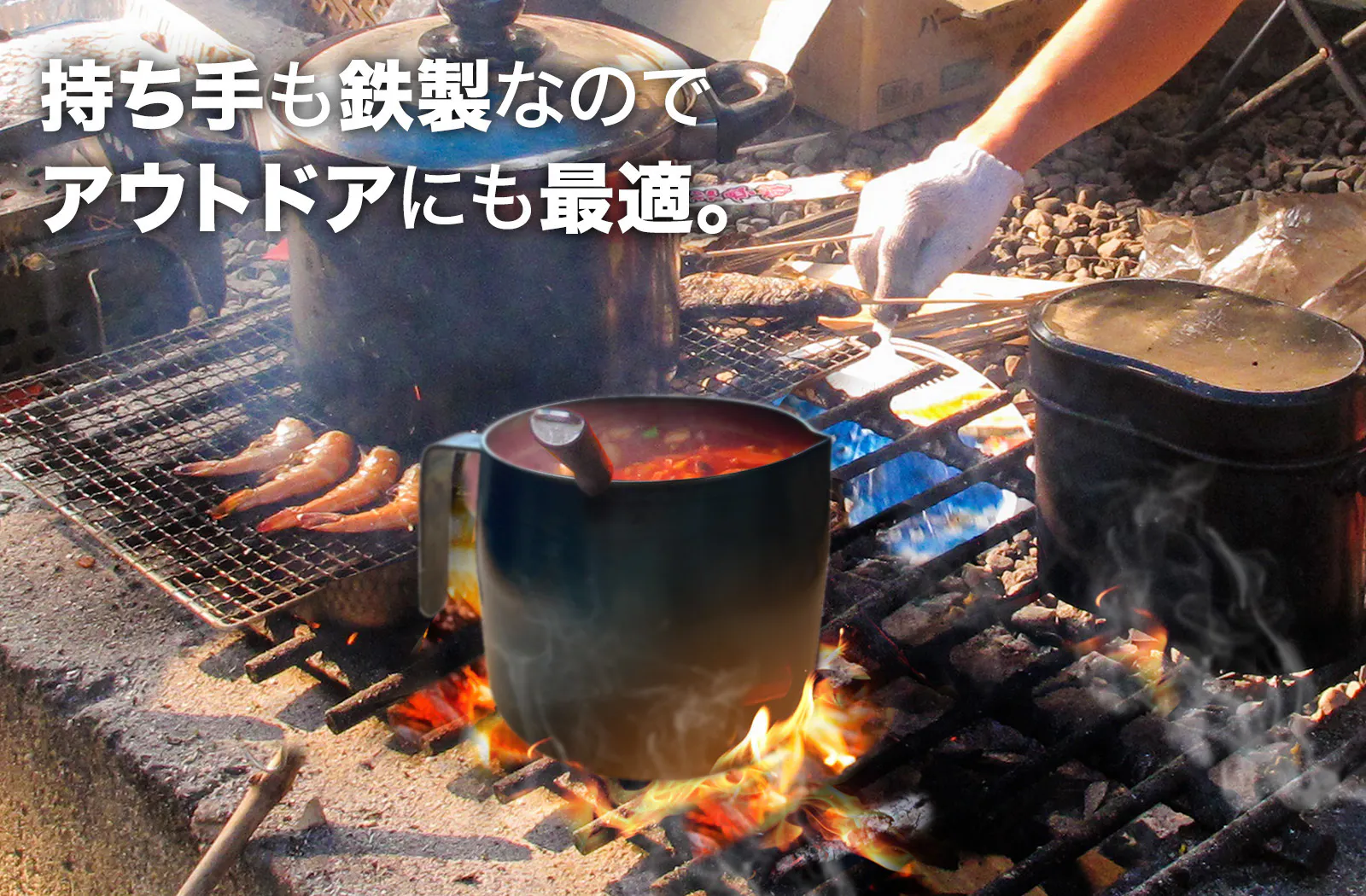 鉄製なのでそのまま薪火や炭火の中に入れて使うこともです。キャンプやBBQなどマルチポットがあればとっても便利です。