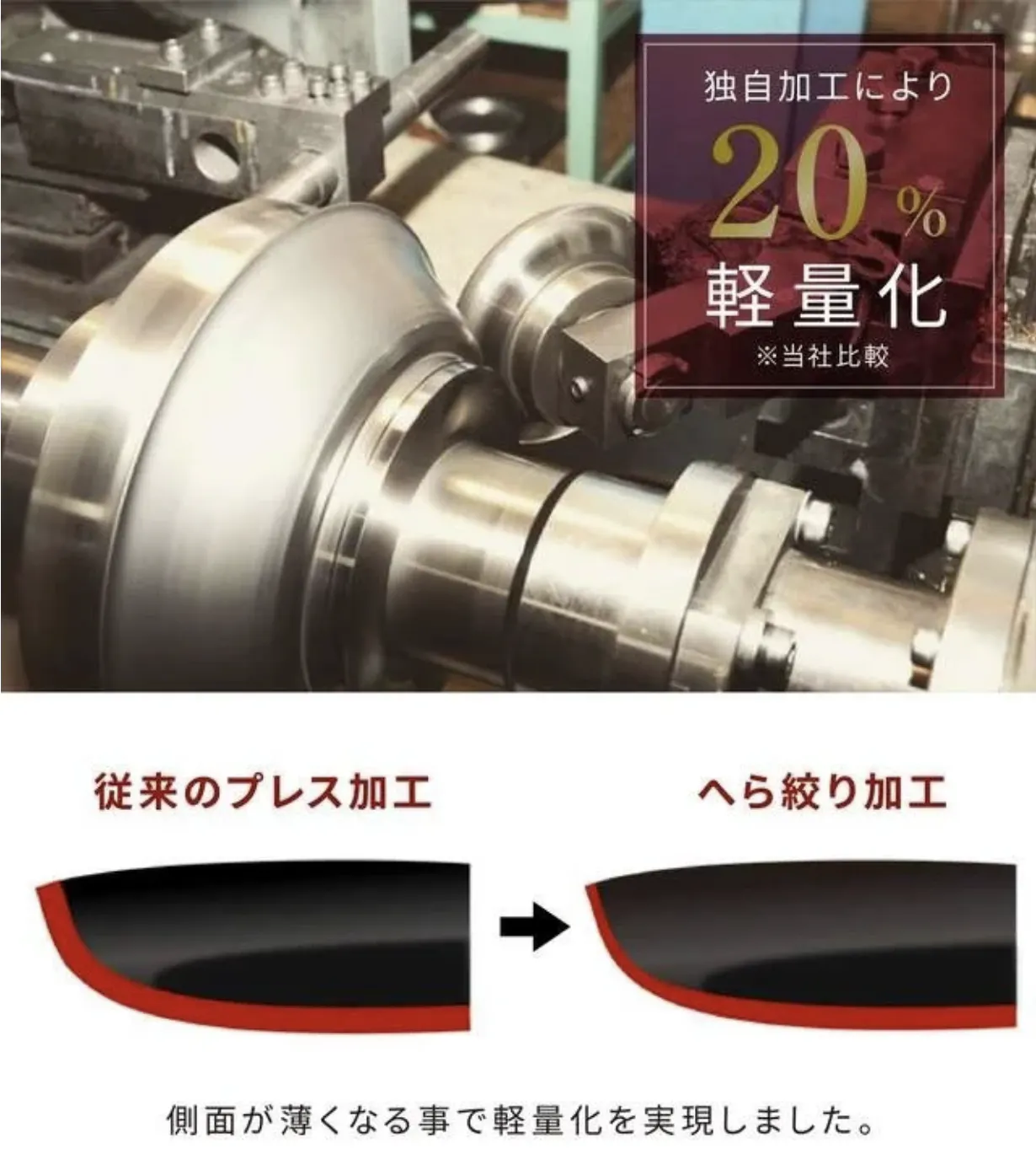 かつて計測したケースで、自社で試作した「20cm」のフライパンで、へら絞りを用いると「約2割」軽くなるという結果となりました。