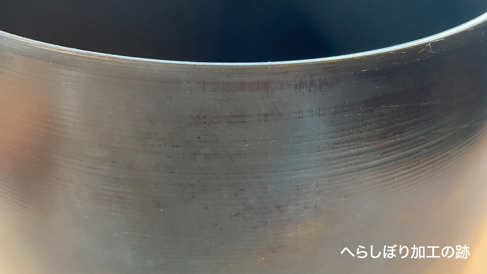 へらしぼり加工は鉄板を引き伸ばして薄くする加工のため、製造工程上、仕上がり跡は加工跡がつきます。製品使用上、問題はございませんのご安心くださ