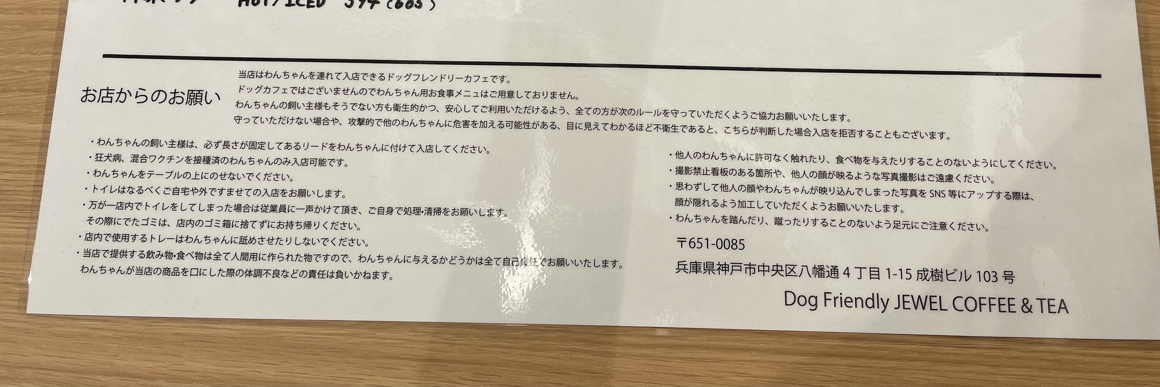 一点だけお願いがあるのですが、店内のわんちゃん連れのお客様と、そうでないお客様とのトラブルを回避する為にお店のルールを守っていただき、双方が心地よい空間になるようご協力お願いいたします。