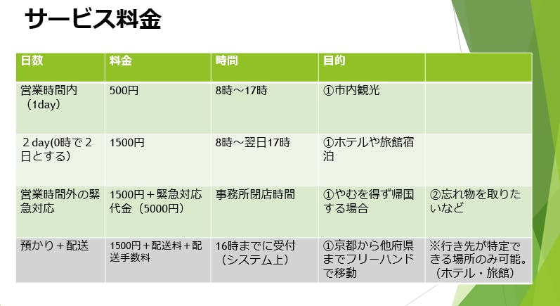 しかし、徐々にこの事業を知ってもらい世に広めていくことで、預かり所の数を増やし、出来るだけたくさんの荷物を預かり、より【京都】という素晴らしい観光地を快適に楽しんでいただくために、少しずつ事業を拡大していけたらと考えております。