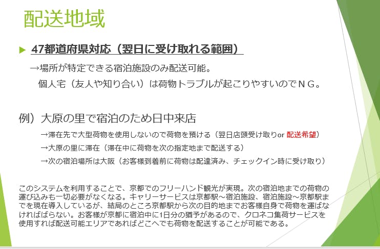 もし、ハンドフリーで観光をしたいと思うなら、既存のサービス【荷物預かり・宿泊先まで配送】を使用すればいいのです。私が知る限り、京都ではCrosta、Sagawaさんが実施しております。