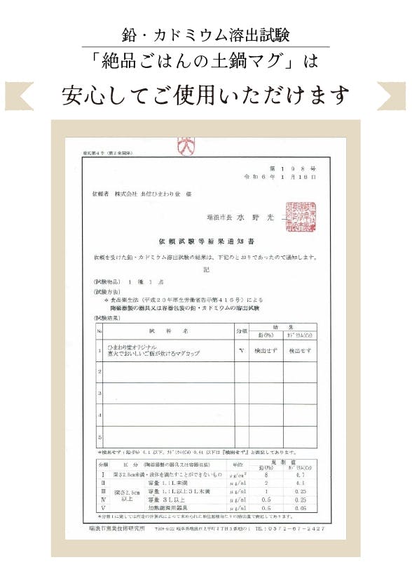 【絶品ごはんの土鍋マグ】で炊飯・料理するにあたって、使っている素材や釉薬に有害なものが混ざっていないかな?というご不安を抱かれている方もいらっしゃるかと思います。